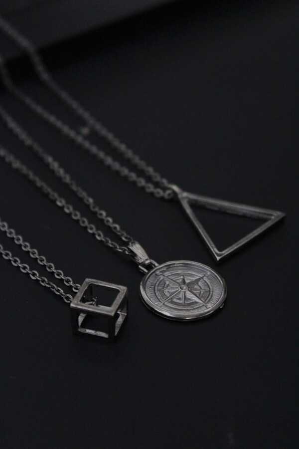 • 3-Pack Black Compass, Cube And Triangle Mens Necklace Set3-piece black compass, cube and triangle mens necklace setChain length : 70 cm.