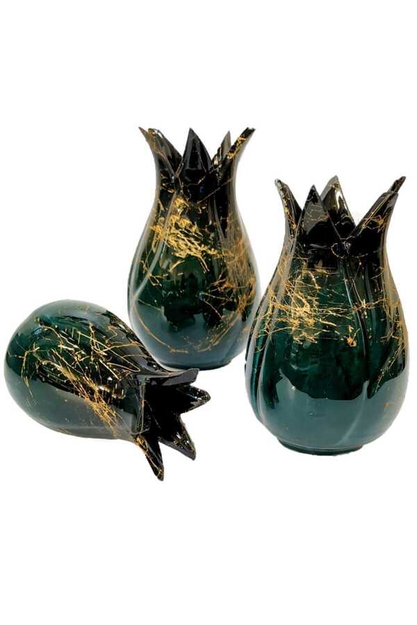 3-piece Tile Tulip Vase Set Completely handmade 3-piece china tulip vase set, upper parts are black to the lower parts, in emerald green tones, which you can gift yourself or as a gift. It is produced in our workshop in Kütahya. Large tulip 15 cm medium tulip 12 cm small tulip 10 cm high. Since the products are handmade, they may vary slightly in color, pattern and size.