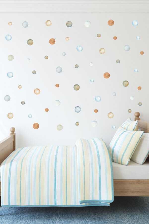 5 Ve 3 Cm Breeze Suluboya Puantiye Çocuk Odası Duvar Sticker SetiKumsala vuran dalgalardan ilham aldığımız Breeze suluboya puantiye stickerlarımızla duvarlarınızın havasını anında değiştirmek ve duvar kağıdı gibi bir görünüm elde etmek çok kolay Ölçüsü ve İçeriği: Toplam 100 adet 5 ve 3 cmdir.Kendisinden yapışkanlıdır. Ekstra bir yapıştırıcı kullanmanız gerekmez. Her parça tek tek uygulanır. Uygulama sıklığınıza göre duvarda 7.9 m2 alan kaplar.Dayanıklı ve kaliteli Alman markası folyo malzemeden üretilmiştir. Yıllarca kullanılabilir.Saten boya, yağlı boya, plastik, ahşap, cam vb. tüm düz yüzeylerde kullanılabilir.Pürüzlü ve tırtıklı yüzeylere iyi yapışmayabilir.Mat görünümlü olduğu için duvar kağıdı gibi durur.Özellikle büyük parçalar söküldüğünde boya kaldırabilir.Sökülüp tekrar kullanılma özelliği yoktur.Nemli bezle nazikçe silinebilir.