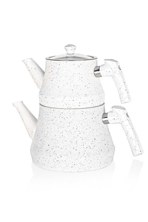 • Bakelite Handled White Teapot-Lower Teapot Lid Not Available. PRODUCT CONTENTS 1 Piece Granite Teapot with Bakelite Handle DIMENSIONS Top: 1.1 Liter Bottom: 2.1 Liter
