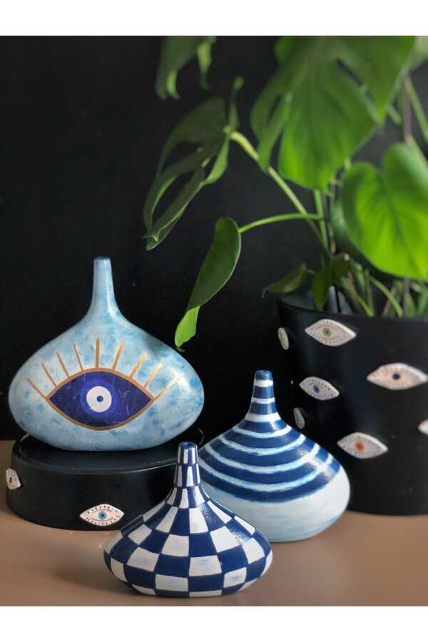 • Blue Series Handmade Triple Ceramic Vase SetProduct Dimensions: Eye Vase 24cm/25cm, Striped Vase 19cm/20cm, Checkered Vase 17cm/15cm