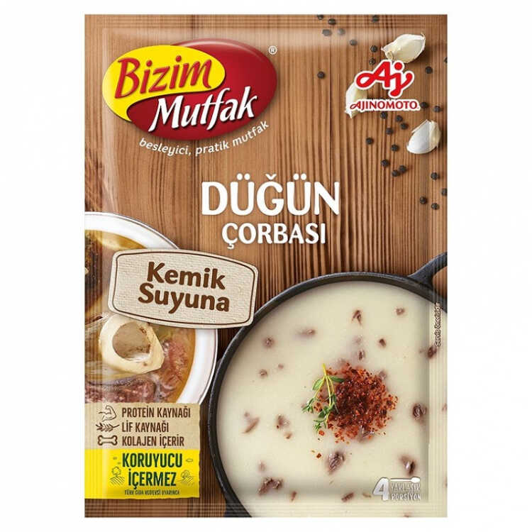 Bizim Mutfak Bone Broth Dugun Soup is prepared by boiling with a liter of water. After boiling the soup, it will be enough to cook on low heat for 10 minutes. You can also flavor your soups with crispy breads. To do this, cut the stale bread in cubes and then fry them gently in the oven. Thus, you will both evaluate your stale breads and sweeten your soup.