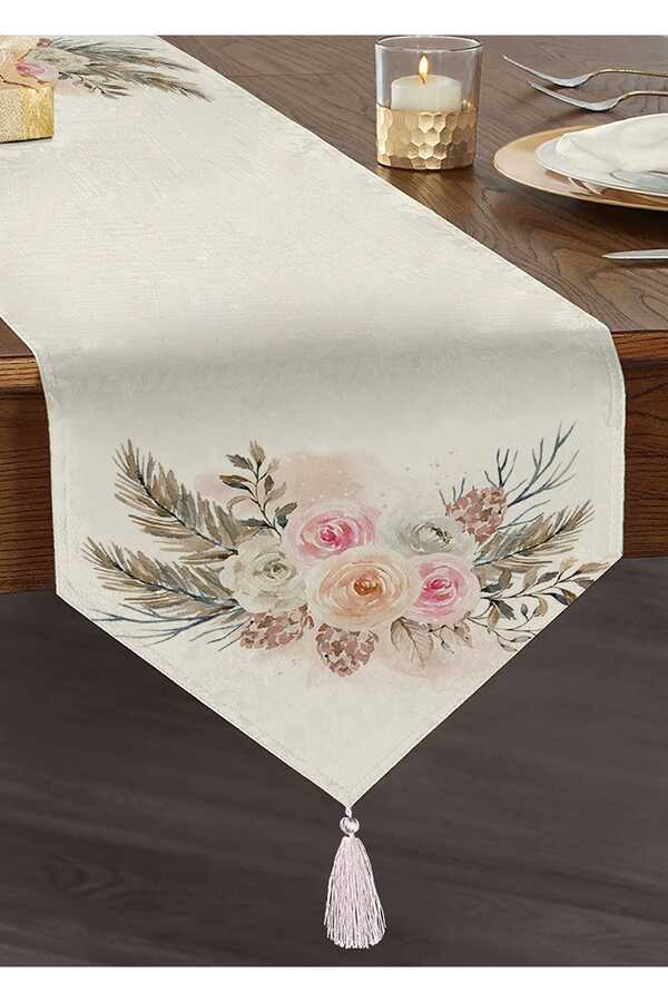 Digital Printed Tasseled Chenille Triangle Runner With Branch And Flower Patterns, add a completely different atmosphere to your table with specially designed triangle runners. It is specially designed with stain-proof fabric feature and digital printing. Product size: 140 x 45 cmFabric: Stain-proof chenille fabric with shiny fiber feature and soft texturePrint: Vivid and realistic 3d digital printing does not fade due to washing and use. Special detail: There are tassels on the end corners and the edges are straight stitched. The runners produced with our brand are produced using the latest technology in our BSCI certified facilities with 3d digital printing technology. The yarn, dye and raw materials used in the production have the Oeko-Tex® standard 100 certificate. T