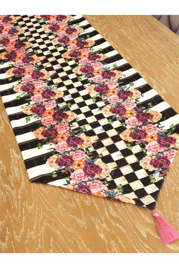 Checkered Rose Pattern RunnerRunner dimensions: 43 x 135 cm. Fabric: It is made of stain-proof micro honeycomb fabric with its special hairy texture of 1st class. Printing: Our digital prints do not fade due to washing and use, they maintain the quality of the first day for years. The sewing of the products is done by making folds. It is completely handcrafted. Both ends are triangular and tasseled.