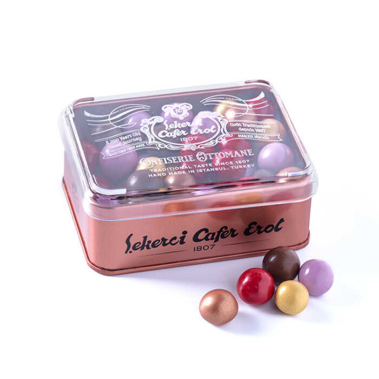 You reach a legendary chocolate taste with the quality of Şekerci Cafer Erol Colorful Chocolate Dragee. Colorful chocolate balls will make your day even more joyful and special. These chocolate dragees in gold, lilac, red, brown, and yellow colors offer a visual feast. It is delivered in an elegant tin box. A gift that can make your loved one feel both happy and special.