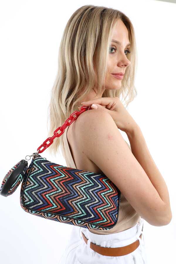 • Colorful Rug Pattern Women's Straw Chain Baguette BagDimensions: Width: 24 cm length: 13 cm width: 8 cm.