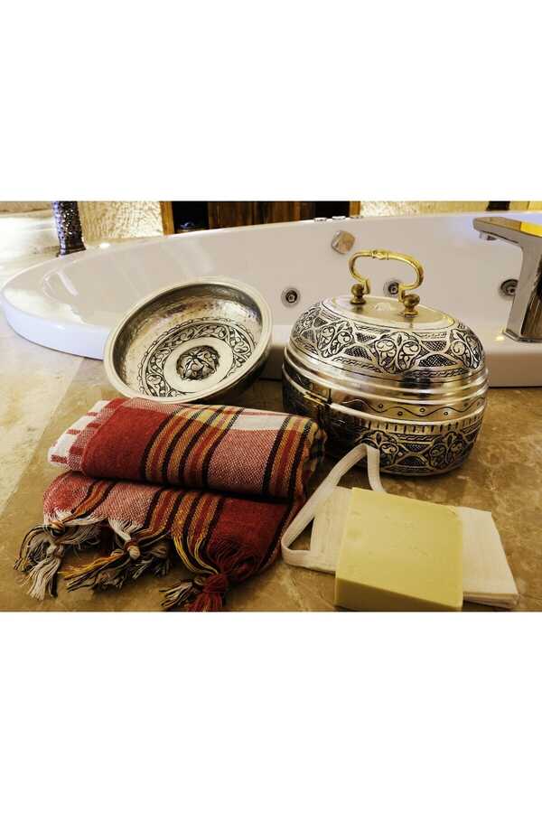 Akır Concept Floral Patterned Embroidered Copper Bath SetSet Contents: Hammam Bowl Clay Holder Peshtemal Olive Oil Soap Pouch Color: Silver Usage Features: Wash by hand with liquid detergent. Do not wash in the machine. Do not contact with bleach. After washing, dry it with a soft cloth. Do not clean with hard sponges. Due to the nature of the copper mine, copper colored products can be oxidized. Since it is not a fabricated product and it is produced by hand, slight differences and irregularities can be seen in each product compared to the other. Product Features: Brand: Content: Handcrafted 100% Copper Products Domestic Production