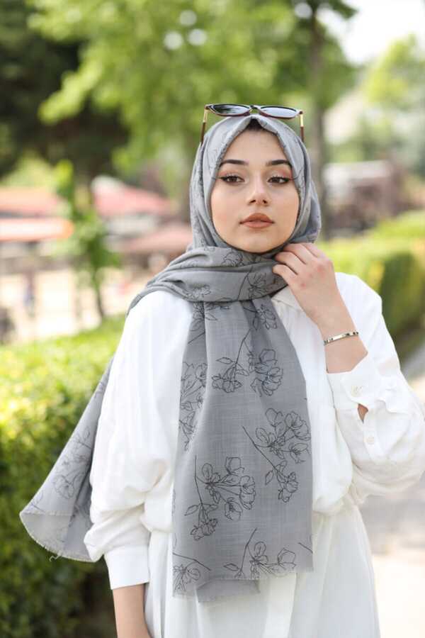 Floral Pattern Shawl Gray The product is a new season product and is made of cotton fabric. It is suitable for use in four seasons. It takes shape easily, stands firm and upright. It is fade and wrinkle resistant. Does not show through, does not slip. Shawl Size 75 x 185 Fabric Information Cotton-Polyester