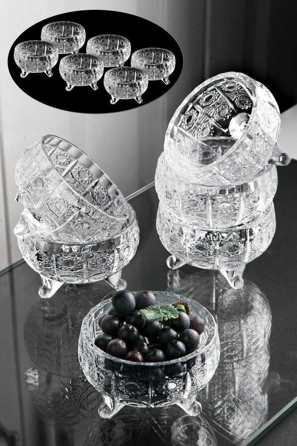 Glass Bowl Set Snack Consist of 6 pieces. The product size is 7.5 x 3 cm. The product is glass. 6 pieces of crystal 3-legged luxury snack bowl set. It can be used in various presentations such as jam, Turkish delight, ice cream, sauce. Diameter 10 cm. Glass product