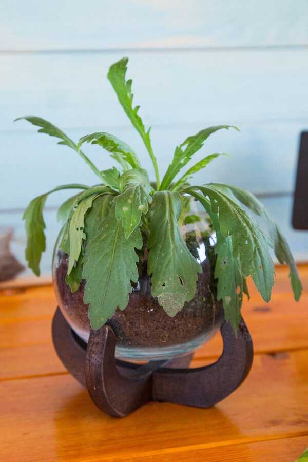 Glass Fanus Flower Holder - With Wooden Stand The product consists of a flower pot and a wooden stand. The wood is made of beech wood. For long-term use, it is recommended to clean with a damp cloth. Length: 13.5 cm Width: 13.5 cm Whole product height: 13 cm