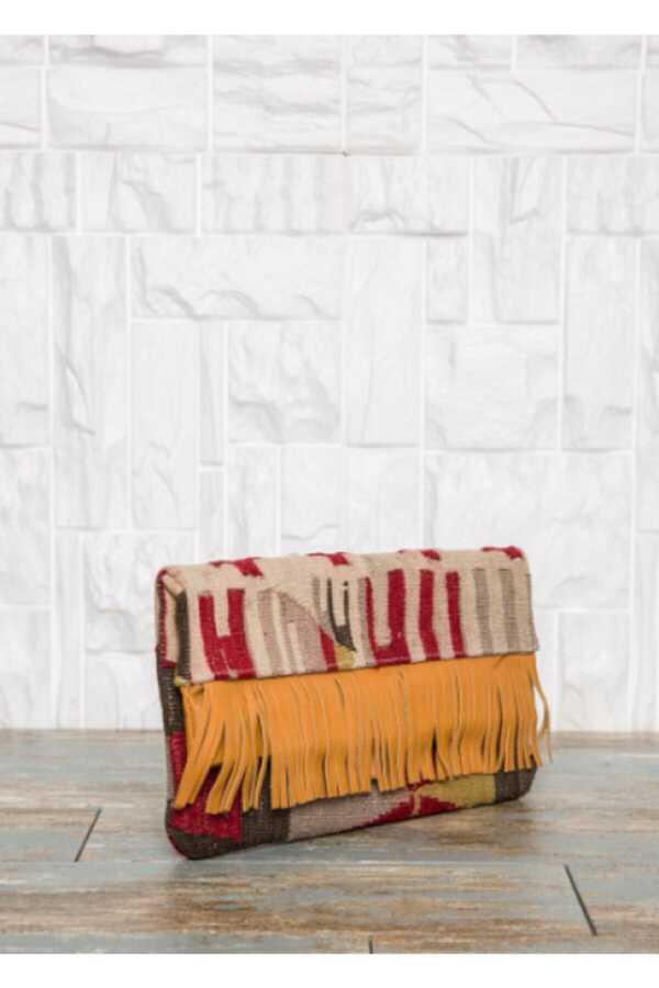 Gray Beige Ethnic Pattern Vintage Kilim Portfolio Orange Leather Detailed Suede Tasseled Red Strap WalletSize : 32 x 20 x 3 cm Closure : Zipper / magnet Stylish portfolio bags made of precious hand-woven rugs and genuine leather are large enough for your most basic accessories. You can also use these retro vintage portfolio bags with traditional geometric patterns as a party or evening dress bag for wallet purposes.