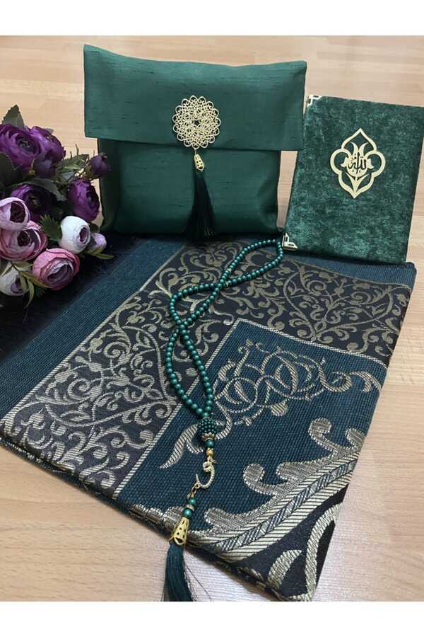 Green Special Slub Bag Dowry Prayer Rug Set 4 pcsAyhanhome luxury 4 pcs slub bag gift dowry prayer rug Gold ornaments have a non-tarnish feature. It has a very stylish look with its tassel detail. Our prayer rug in the set is 110x70cm.