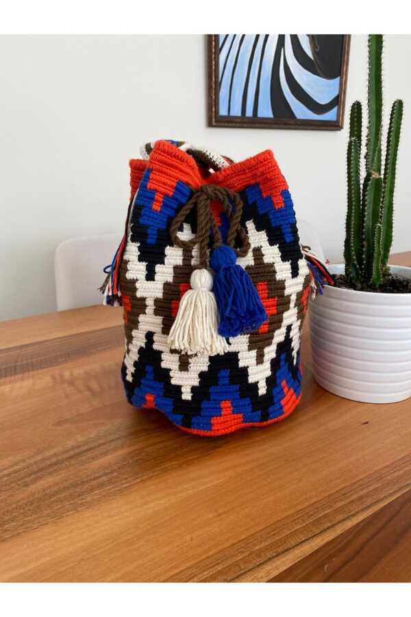 Wayuu Bag-Orange with a Rug Pattern in Blue Tones -1 Piece 100% hand knitted Organic cotton rope used in Wayuu technique Height 30 cm base diameter 28cm It will add elegance to your elegance.