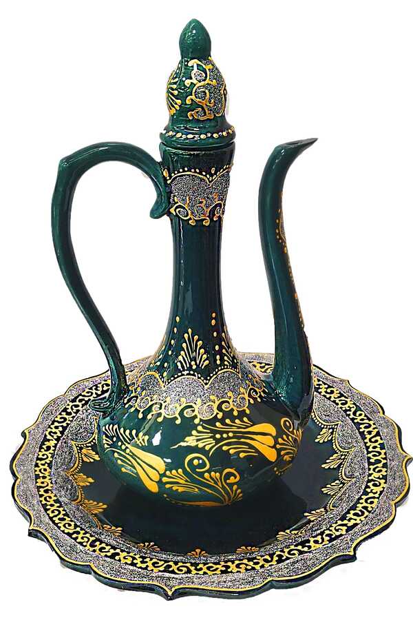 Handmade Large Size Ceramic Pitcher (with plate) gold-silver Color Gilt Embroidered Green Turquoise Color Completely handmade Kütahya ceramic medium large size tile pitcher A very stylish product that you can present to yourself or as a gift. It is domestic production and produced in our workshops in Kütahya. It has a dazzling visual that will add a very pleasant atmosphere to your home and office. Product dimensions Ibrik are 34x18x15 cm. It is 35 cm high with its lower plate. Bottom plate is 30 cm in diameter. Product features Turquoise green - Dark green tones. It is gilded in gold and silver color.