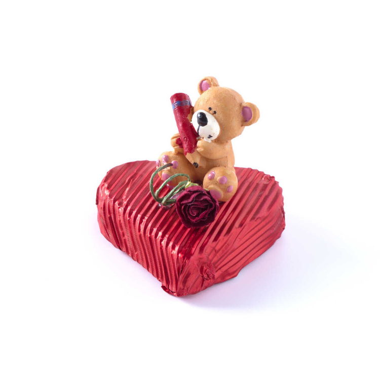 You do not have to give your lover a big gift on Valentine's Day. The important thing is to know how your loved one will be happy. Sometimes a tiny chocolate is worth more than the biggest gift. That small but cute gift could be this chocolate. Heart-shaped chocolate with a cute teddy bear holding pen figure on the package can make your loved one very happy. And if there is a rose in front of this bear, then it can make your lover even happier!