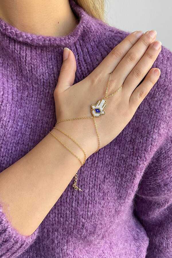 • Uces Miyuki Fatma's Hand Sahmeran BraceletGold plated chain bracelet with Miyuki bead