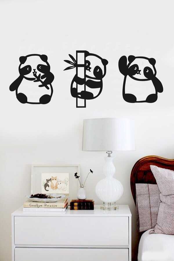 Panda 3lü Duvar Dekoru Siyah Ahşap Lazer TabloÜrün 3 mm siyah mdf malzemeden üretilmektedir.Resimdeki tasarıma göre kapladığı alan: 105x38 Cmdir. Soldan sağa 29x33 Cm, 29x38 Cm 29x30 Cm dir.Ürün uygulamasını paket içerisinden çıkacak olan çift taraflı bant ile istediğiniz kombini oluşturarak yapıştırabilirsiniz.Sadece hafif nemli bir bez ile temizlenmelidir.