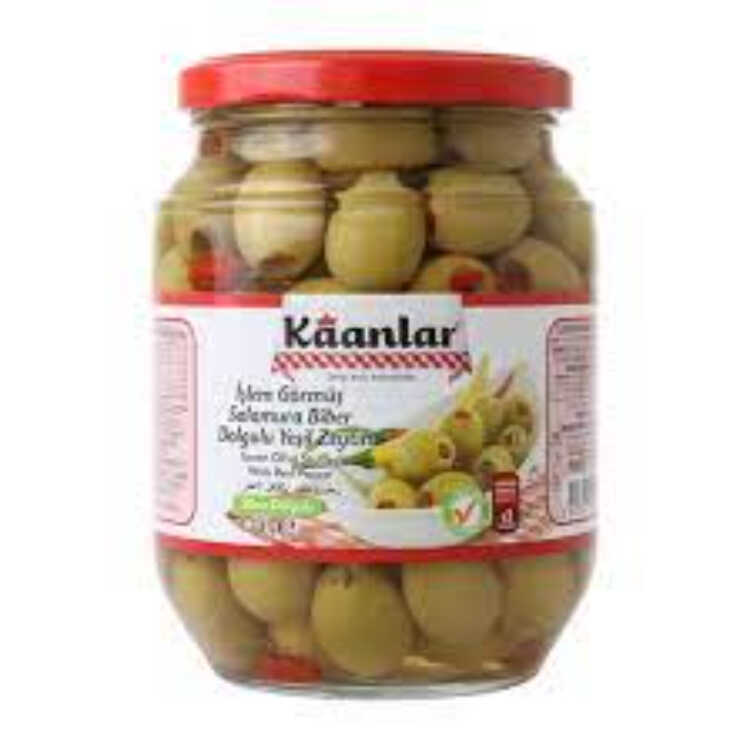 Kaanlar Peppered Green Olives is a product of pickled green olives with pepper filling. Pepper-filled olives prepared with special handwork are the complementary flavor of your tables. The taste of stuffed green olives, sweetened by brine, is mild.