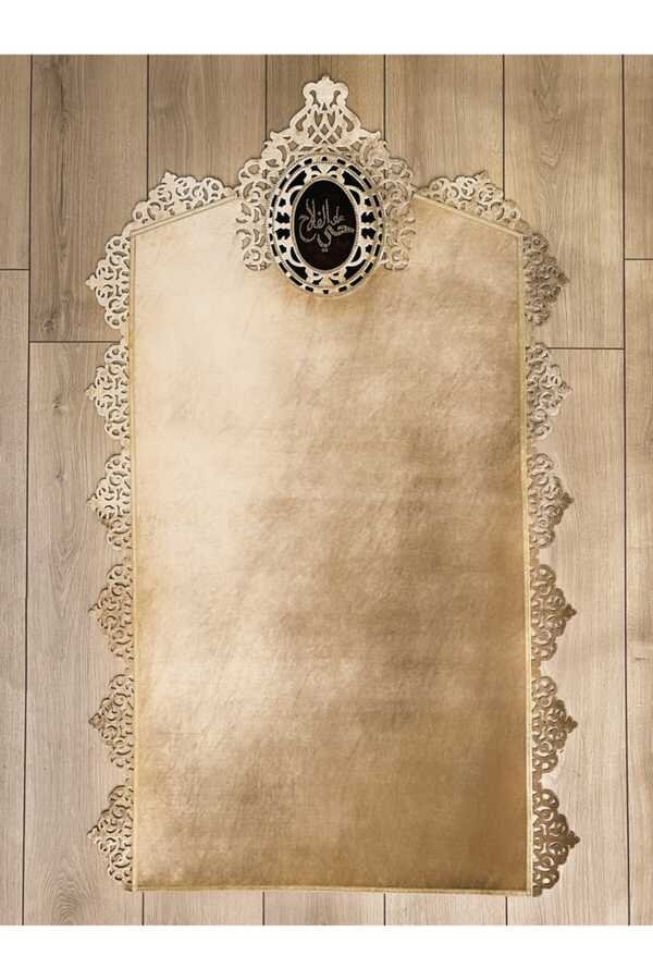 Dream Gold Prayer Rug, Double-Sided Velvet Our specially designed prayer rugs produced with our environmentally friendly first class velvet combine 2 layers of fabric so that you can pray comfortably and comfortably, providing a solid and stylish stance. Although it is light, each prayer rug has its own special chassis for you to store it easily and keep it long-lasting. Inspire your prayers with our luxury and handmade prayer rugs. Prayer rug size: 80 x 137 cm. Washing instructions: It can be washed in delicate washing, without wringing. It is a unique design that combines modernity, elegance and quality. To buy this product with SECCADE BAG,