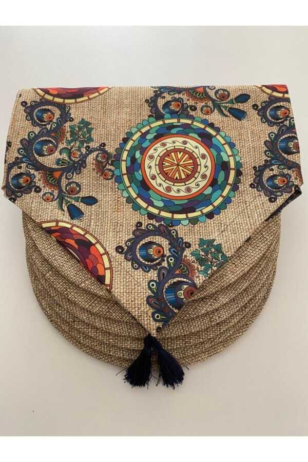 Sack Floor Ethnic Mandala Pattern Runner 6 Ready Printed Cover Placemat Set Our cover covers are manufactured with hidden elastic at the bottom so that they can be easily removed and washed. Raw mdf is used on one side and cut with laser cutting. Runner dimensions: 40*140 cm. Supla dimension: 330x3 mm. It is offered for sale. Stain-proof Easy to wash First quality digital printing fabric It can be used safely for years It is made of stain-proof polyester yarn with its special texture. Washing instructions Delicate wash at 30 degrees. Optical detergent, bleach and bleach are not used. It is not suitable for drying in the dryer. Iron from the reverse side.
