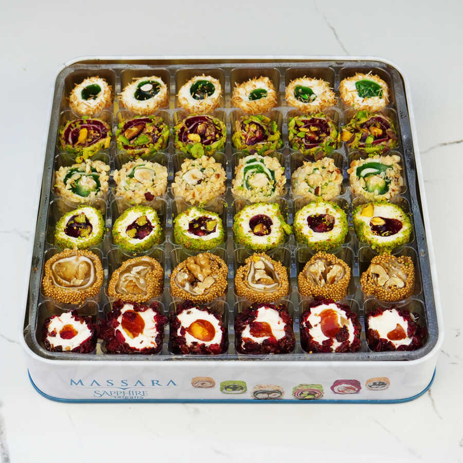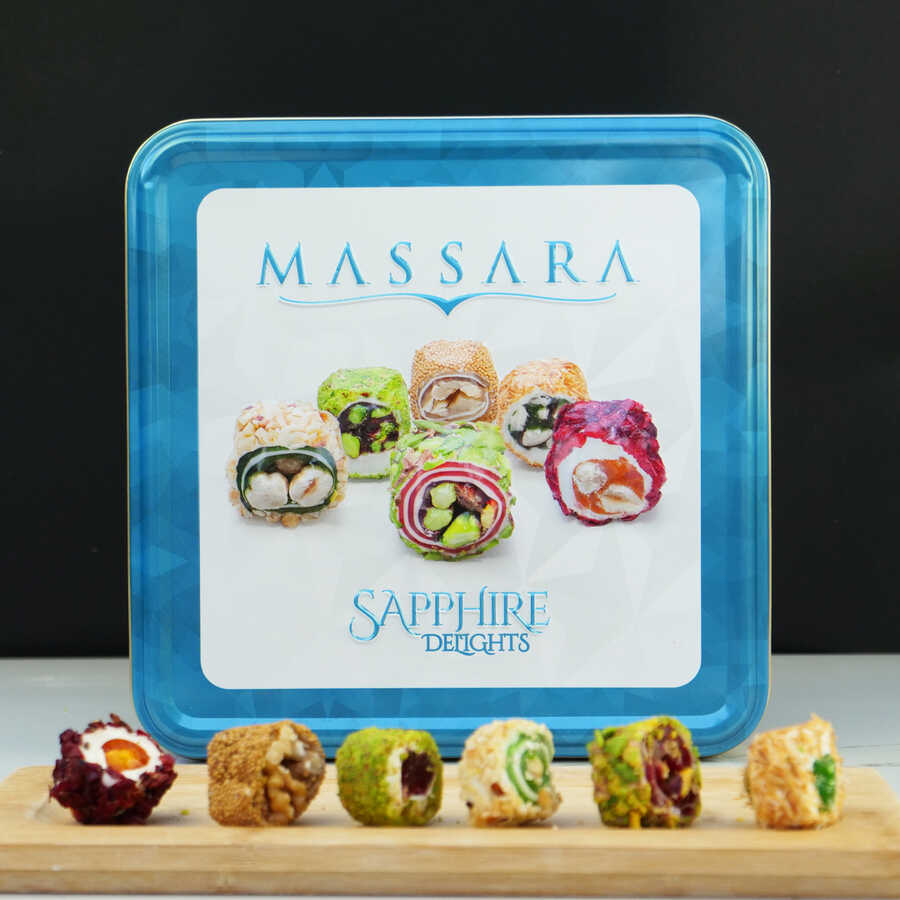 Massara packed the blissful taste into the Sapphire box. The delicious Massara Sapphire Turkish Delights flavor decorated with crispy kadaif pieces and pistachios meets chocolate! Double roasted pistachios with delicious varieties, hazelnuts that do not compromise their freshness, and the indispensable chocolate taste will leave a mark on your palate.