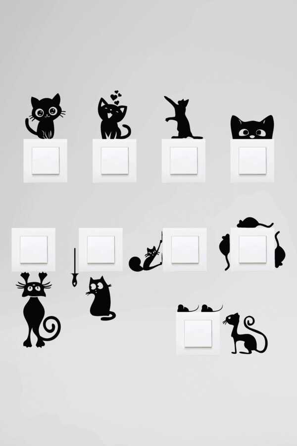 Socket Cat Sticker Set Black Label Wall Sticker Let your sockets, your home come alive! Do not miss this quality product that will look very stylish on your wall. There are 9 stickers of 9x9cm. It will be sent as laminated and will be long-lasting. It will come on transfer paper so it can be applied easily. It is produced with quality products of German origin. It is produced by us as completely original digital.