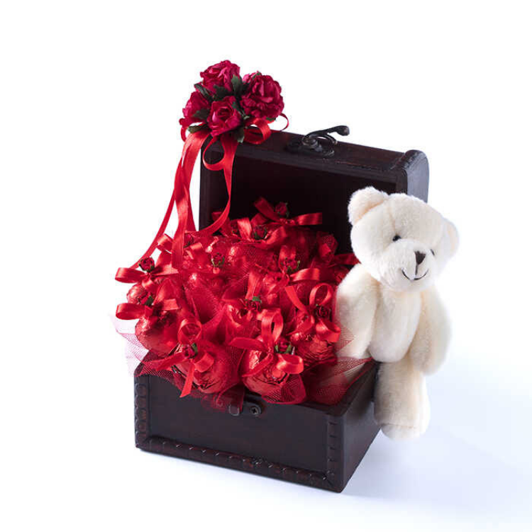 Reflect your feelings with Şekerci Cafer Erol’s specially decorated chocolates prepared for Valentine's Day. Make a difference on Valentine's Day with Special Chocolate in Small Wood Box. The wooden box creates a warmer atmosphere. The white teddy bear hanging next to the box is also an innocent representation of love. There are 14 special chocolates in the wooden box.