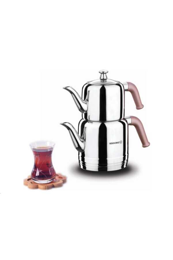 A189-01 Riva Steel Teapot Set Rosa Fma05095Korkmaz A189-01 Riva Steel Teapot Set RosaKorkmaz A189-01 Riva Teapot Set Top 1.1 lt / Bottom 1.9lt 18/10 Cr-Ni Stainless Steel Carefully polished outer surfaces that maintain their shine. Ergonomic and hand-free colored bakelite handles Riva teapot set provides maximum time and energy savings thanks to its Solar Base base system, which provides the highest heat transfer on all types of cookers, including induction.