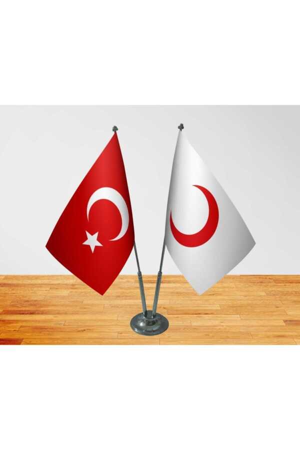 Table Top Red Crescent Flag Turkish Flag Double Chrome Poles Table FlagTable Flags / Double Layer Satin Fabric 1 Pcs. With Logo -1 pcs. Turkish Table Flag Size 15x22.5 cm