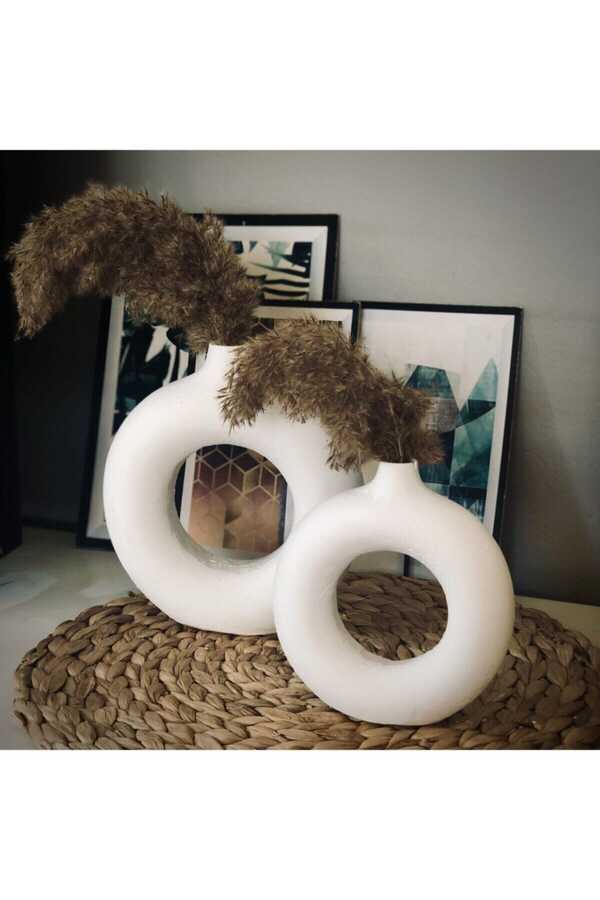White Ring Vase 2-PieceWhite Ring 2-Piece Decorative Vase It is produced from a mixture of marble powder. It is completely handmade. There is a broken appearance at the end of the product depending on its decor. Flowers are not included in the product content. Large size is 19x17 cm Small size: 15x14 cm. Maximum 10 pieces of this product can be ordered.