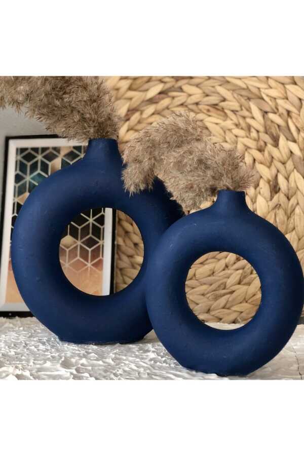 Dark Blue Ring Vase Set of 2 It is made of stone and marble dust. It is completely handcrafted. It has a matte structure and should only be cleaned with a damp cloth. Due to the product decor, there is a broken appearance at the ends. Flowers are not included in the product content. Hand Minor errors are observed in manufactured products. Size is large 19x17, Small size is 15x14 cm. The seller determines the selling price of the product you have examined.