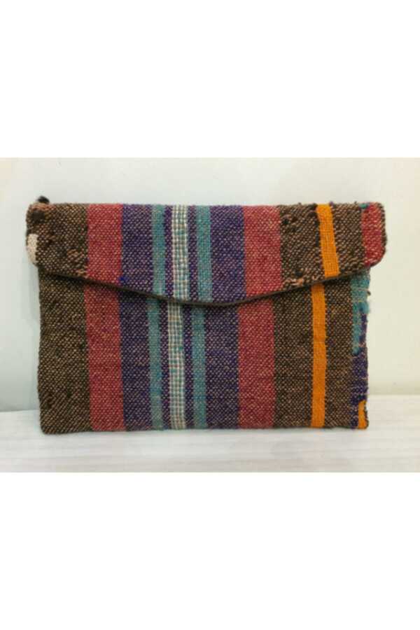 Women's Classic Striped Woven Rug Brown Hand Bag Clad Buckled Leather Portfolio Envelope BagSize : 30 x 18 x 4 cm Closure : Magnet Stylish portfolio bags made of precious hand-woven rugs and genuine leather are large enough for your most basic accessories. You can also use these retro vintage portfolio bags with traditional patterns as a party or evening dress bag for wallet purposes. The leather strap used optionally will be sent with the bag.