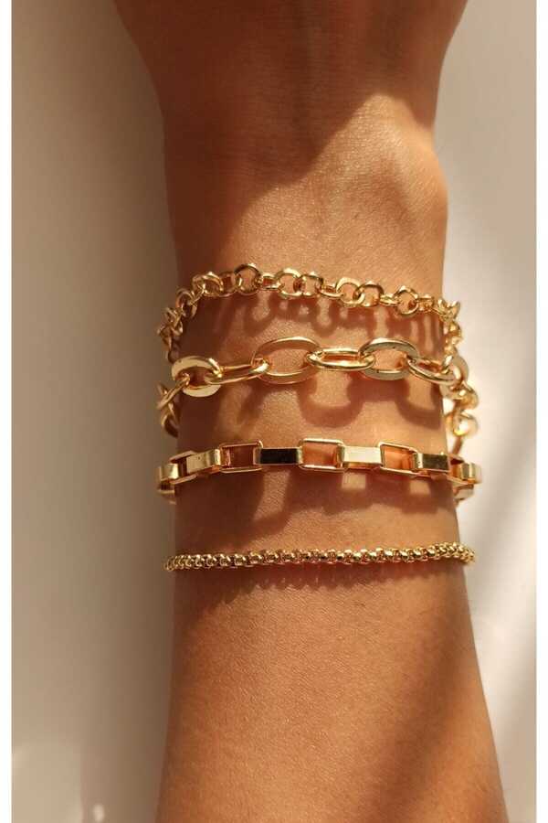 Women's Gold Quadruple Combination Chain Bracelet. Size: Standard size, adjustable. Special coating is used against tarnishing. Contact with substances such as cream, perfume, alcohol should be avoided.