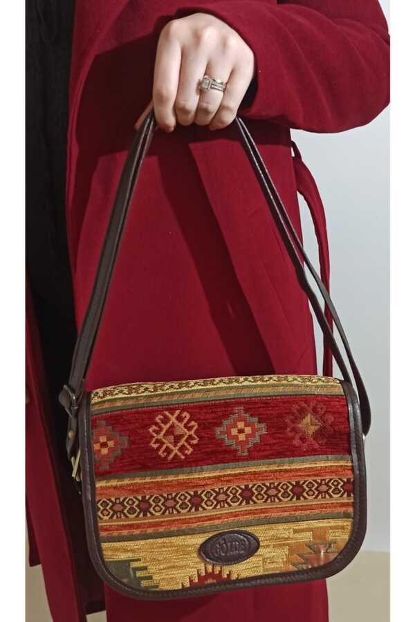 Women's Red Round Rug Patterned Vegan Leather Crossbody Bag · red and cream patterned · -100% vegan leather · -Kilim patterned tapestry · shoulder bag · handbag · crossbody bag · dimensions: · bottom base: 27 cm · height: 18 cm Width : 11 cm
