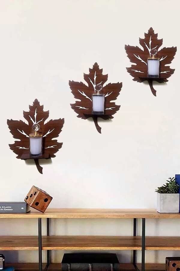 Wooden Wall Ornament Shelf Leaf Candle Holder Wall Decor 3 Piece